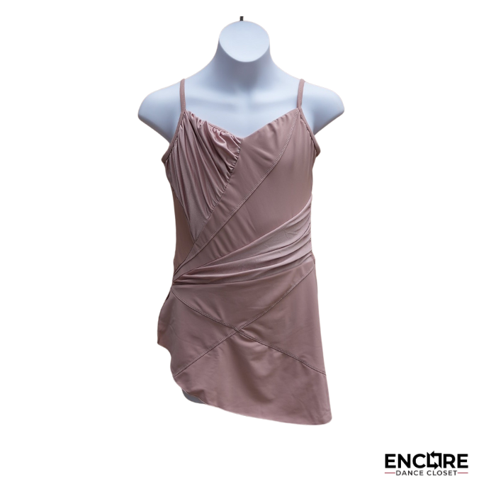 A minimalist blush nude lyrical dress designed with soft draping and diagonal ruching for elegant lines. The fitted bodice flows into an asymmetrical skirt, creating effortless movement. A versatile contemporary costume that enhances storytelling on stage.