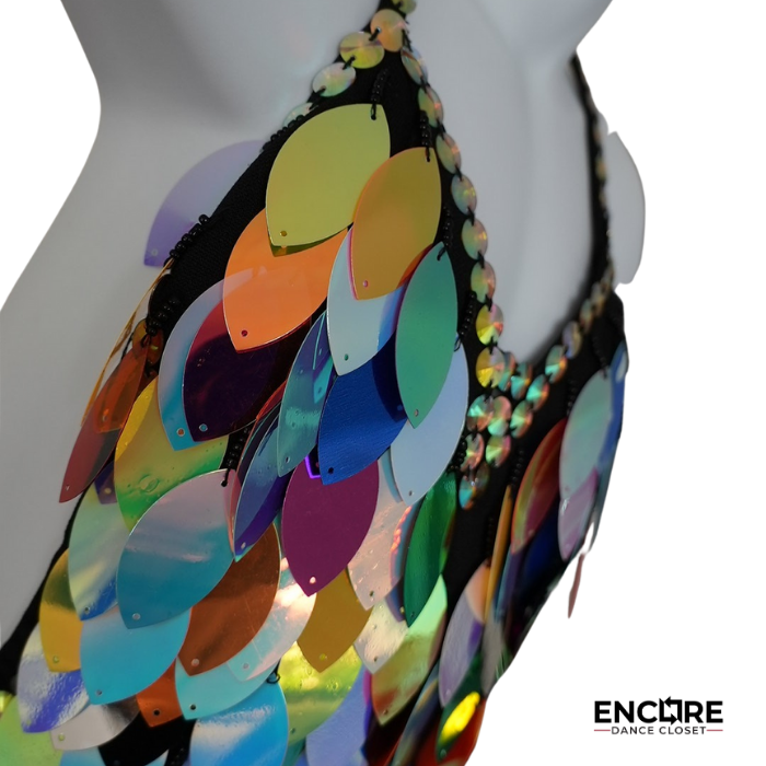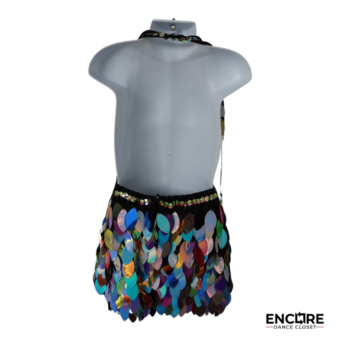A showstopper covered in oversized iridescent sequins that reflect every color of the rainbow. This halter dress delivers maximum stage impact with a bold, playful design that moves dramatically with every step. A perfect fit for jazz or upbeat solos.