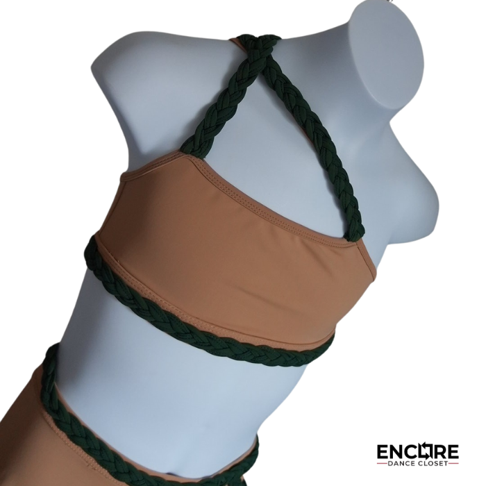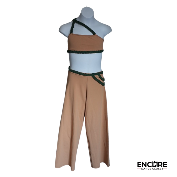 Flowy nude wide-leg pants meet a sleek asymmetrical bra in this understated beauty. Green braided accents at the hip and shoulder add earthy, modern texture. Minimalist and grounded—perfect for lyrical or contemporary pieces.