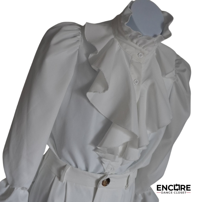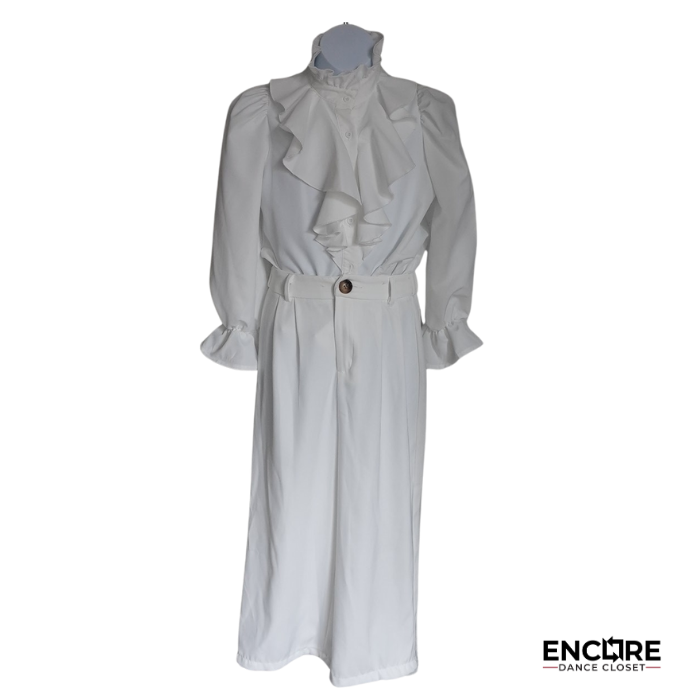 Sleepwear meets stagewear in this whimsical pajama-inspired look. A white ruffled blouse and flowing wide-leg pants give off serene dreamscape vibes. Ideal for storytelling pieces or soft, character-driven performances. This costume has been sewn together to easily put on and off as a jumpsuit.