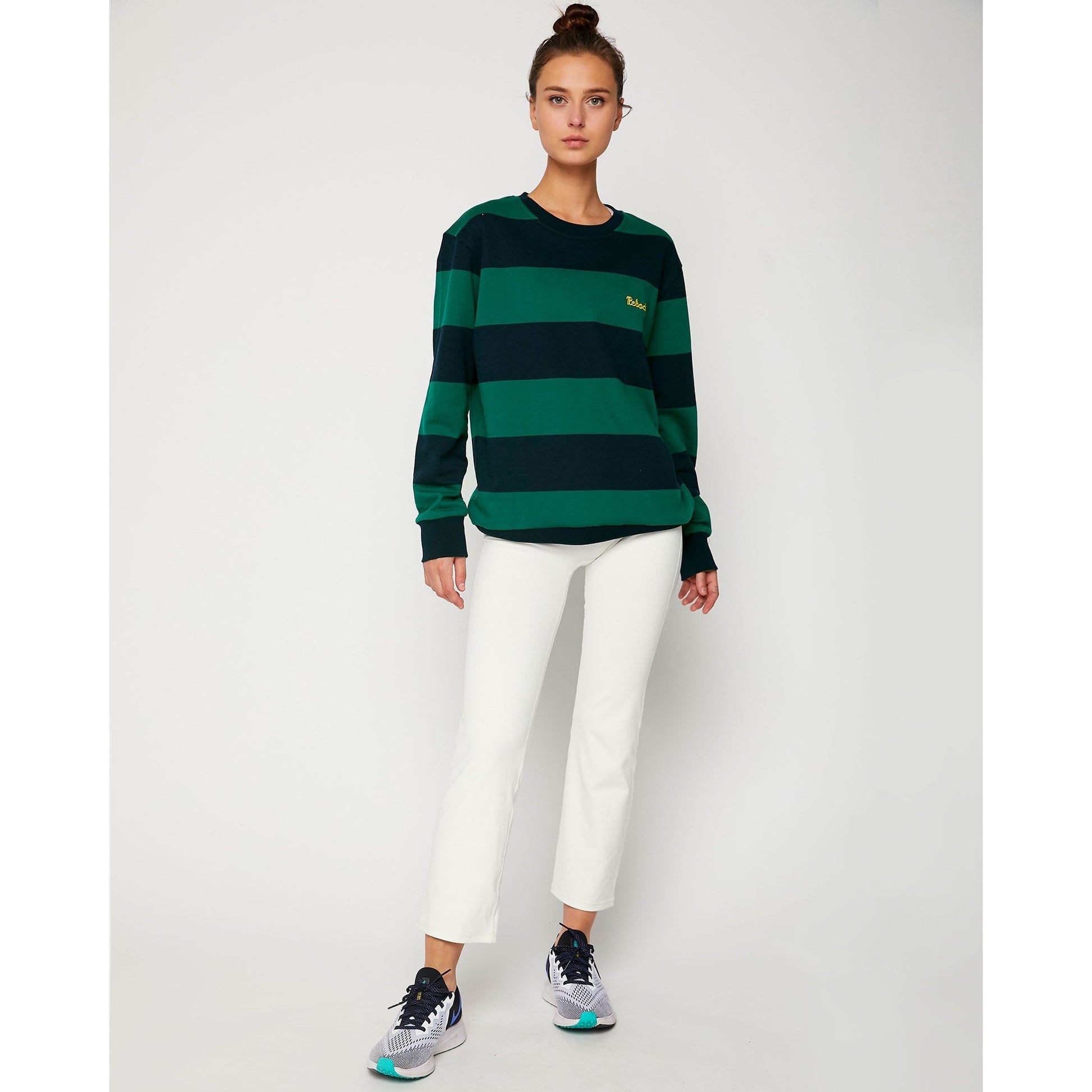 Seasonal and off season, a rugby striped french terry sweatshirt is a classic fave. Wear it over a dress shirt for a commute look and over biker shorts for to the court. Rugby inspired spired sweatshirt. Features embroidered cursive Rebody logo. Made in yarn dyed french terry.