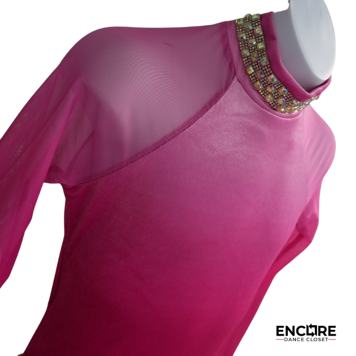 Long-sleeve hot pink ombré bodysuit with crystal neckline and waist, finished with layers of fringe. Ideal for sassy jazz or musical theatre numbers.