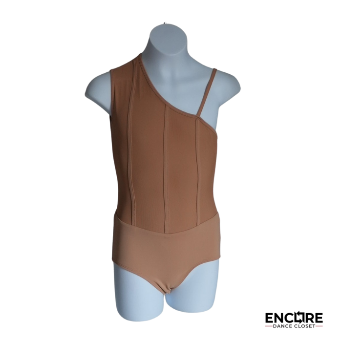 A raw, introspective look. The asymmetrical leotard features ribbed textures across the torso, paired with nude pants and a soft mesh skirt overlay. A minimalist masterpiece for grounded, emotional pieces.
