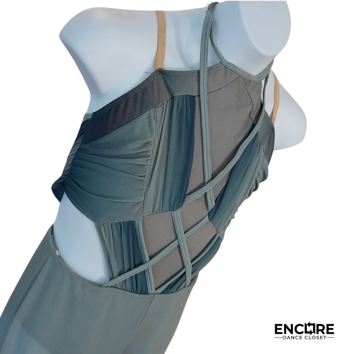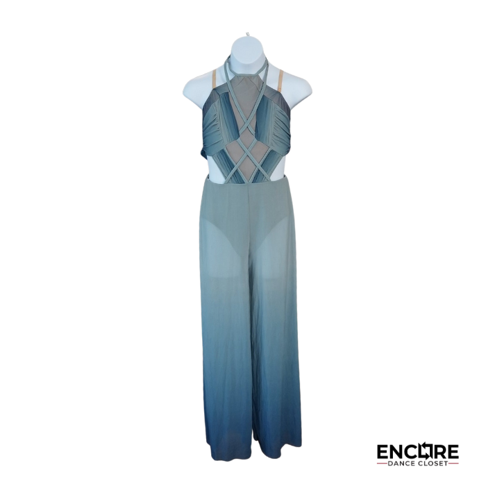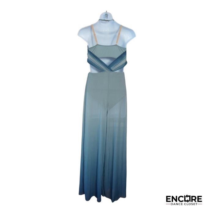 A stunning ombre unitard fading from smoky gray to deep ocean blue. Crisscross mesh bodice with open sides and wide chiffon legs for fluid extension. Perfect for contemporary or lyrical performances where grace meets strength.