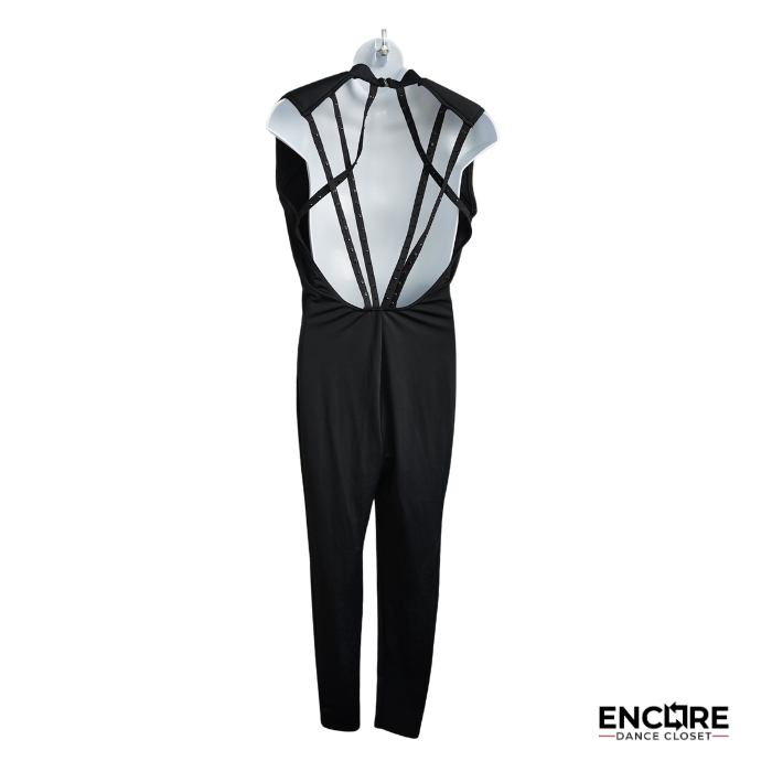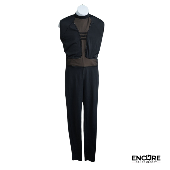 Sleek black jumpsuit with sheer brown mesh insets and studded detailing, adding power and intensity to contemporary or acro performances.