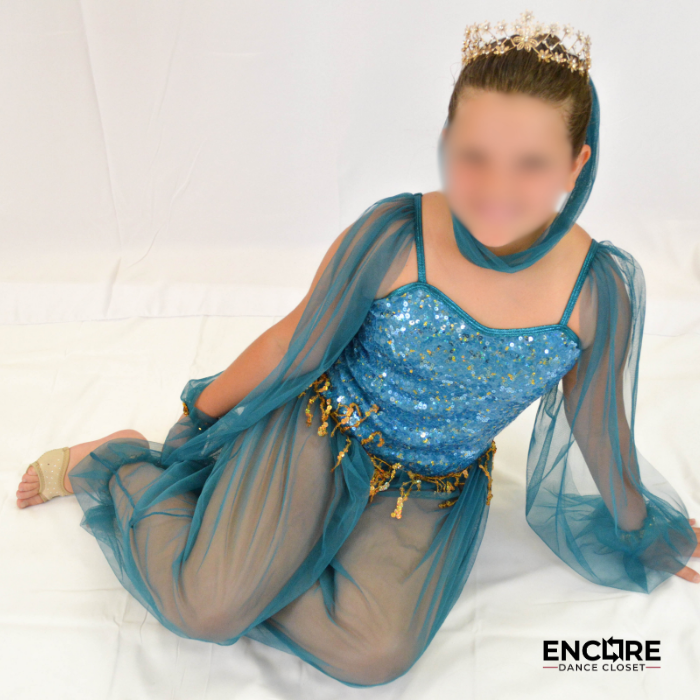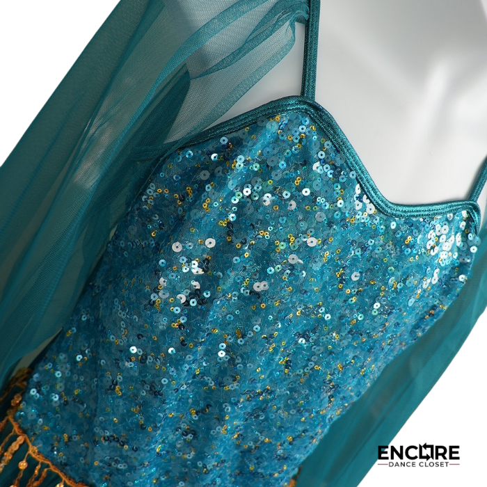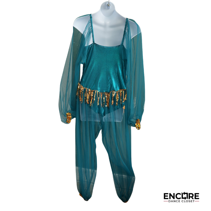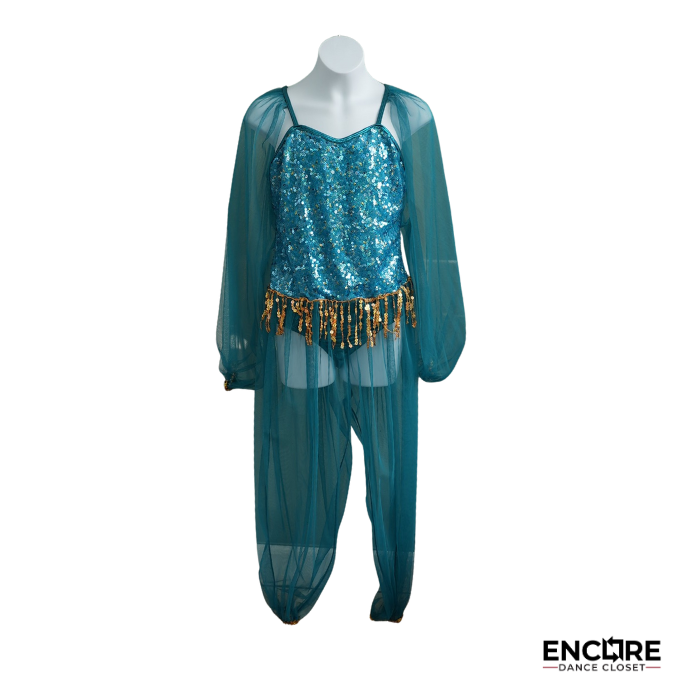 Turquoise sequin top with gold coin fringe and sheer harem pants — a dazzling jazz or character piece with bold flair and sparkle. Includes gold tiara.