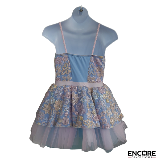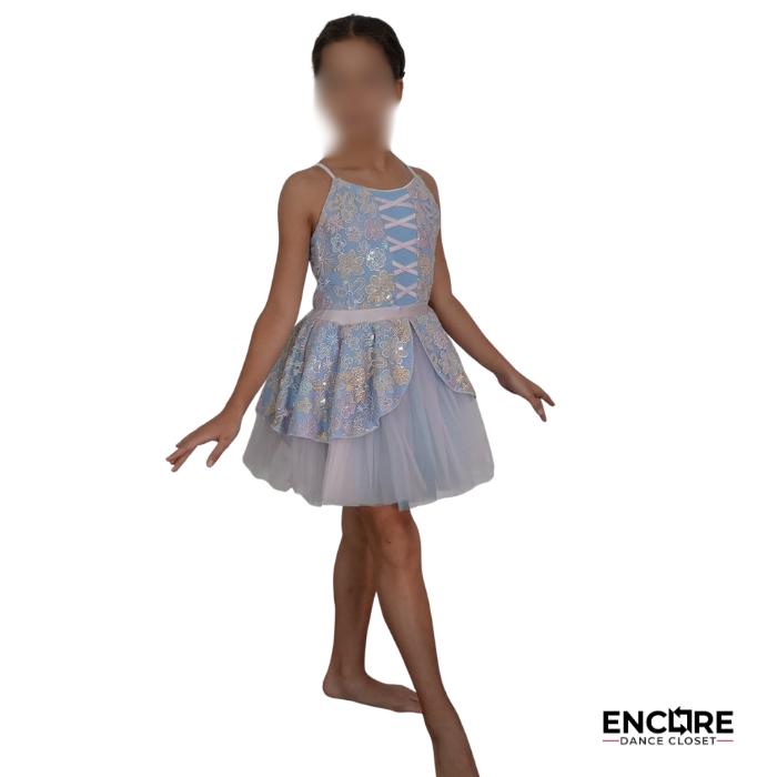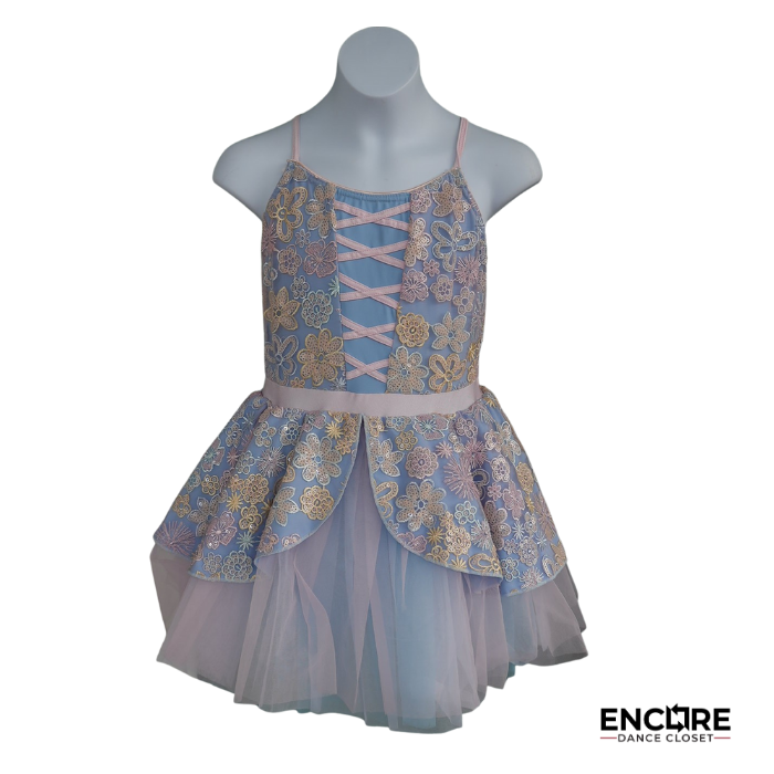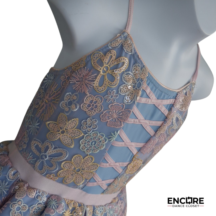 Pastel blue and pink tutu with embroidered floral lace, ribbon corset detail, and layered tulle skirt. A dreamy ballet or lyrical costume for recitals and solos.